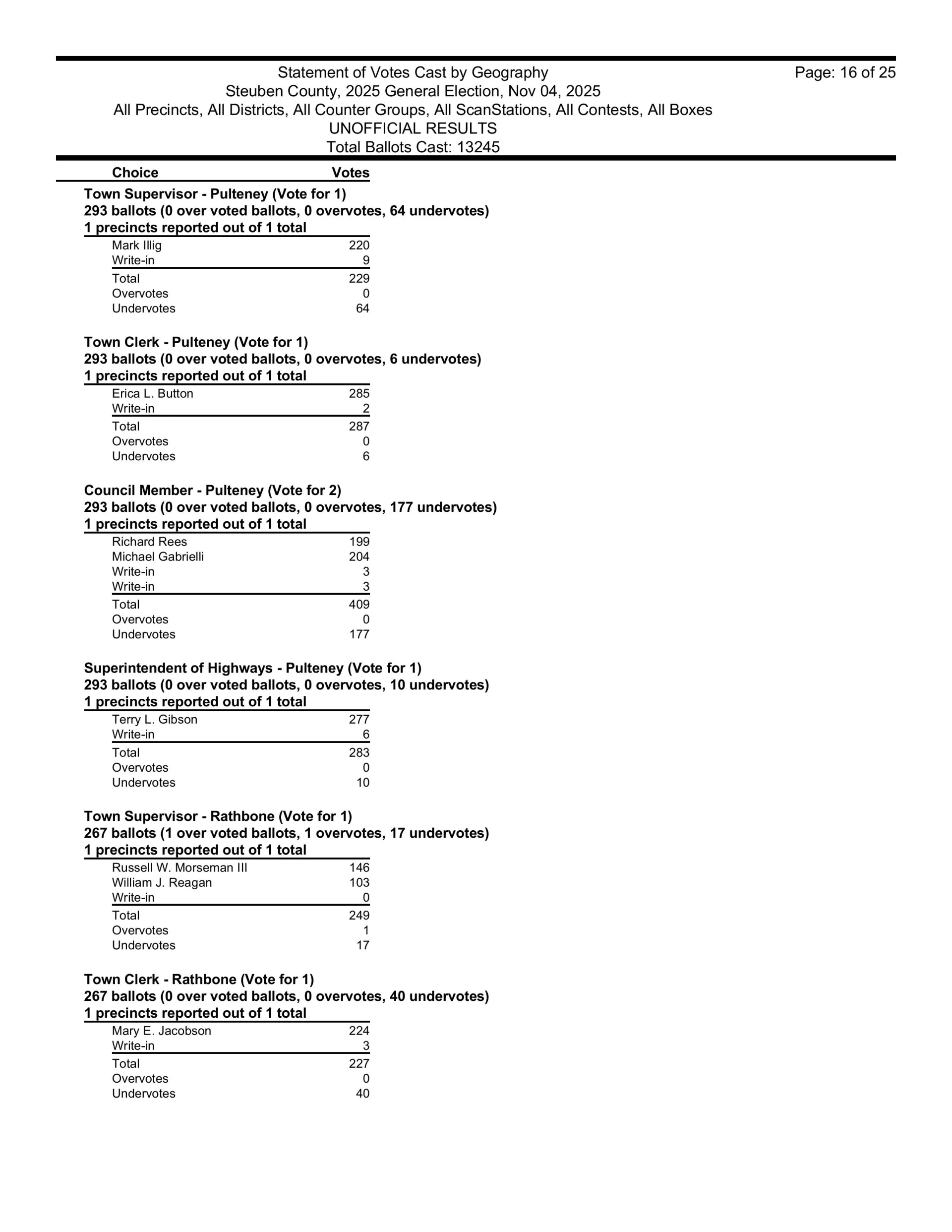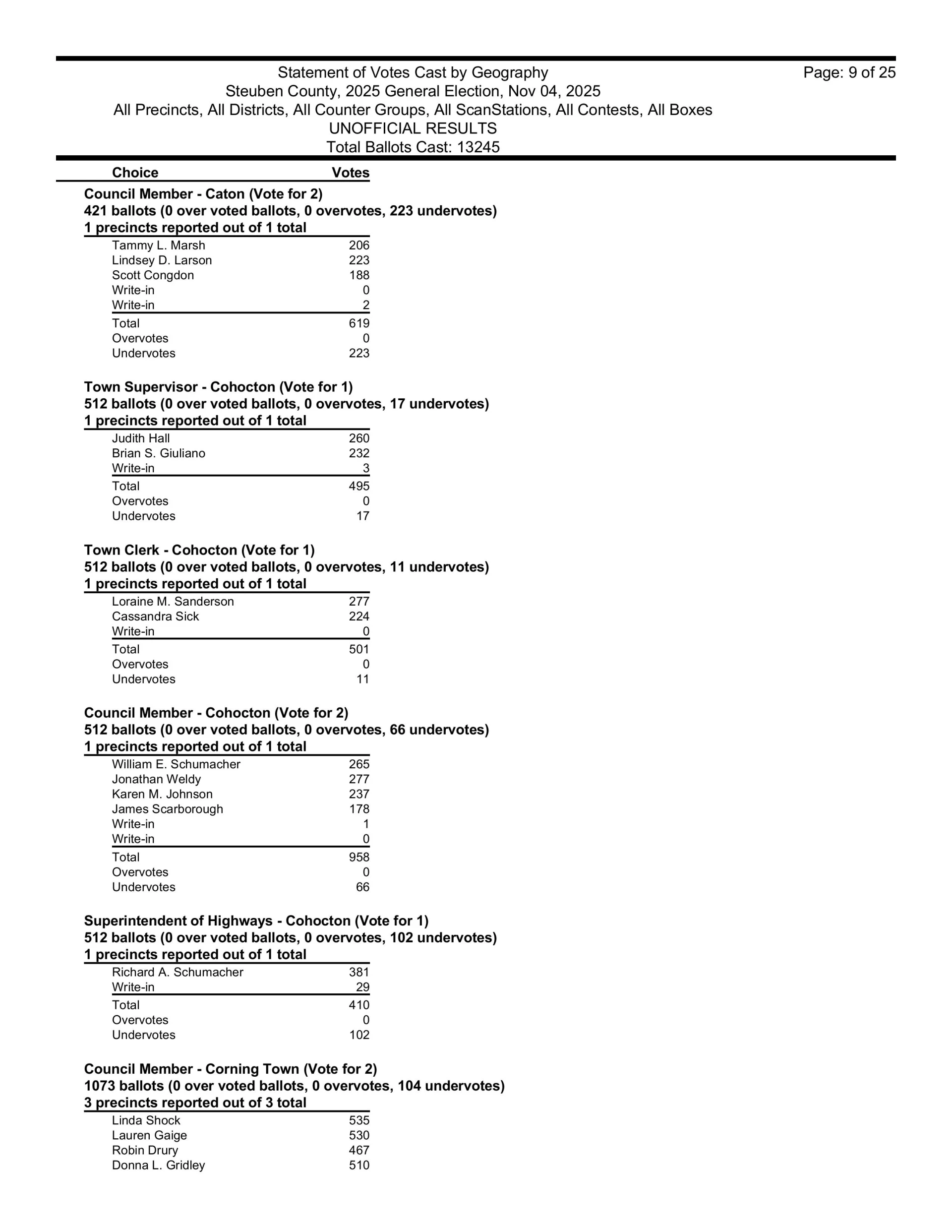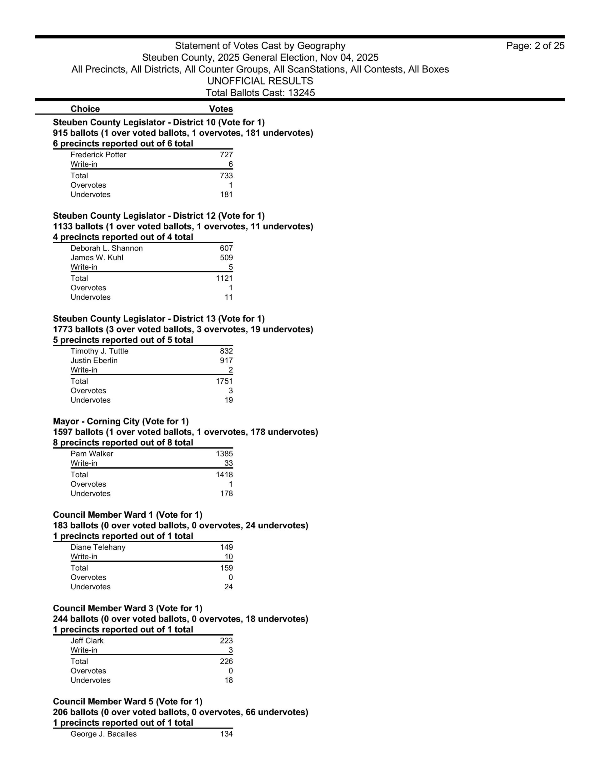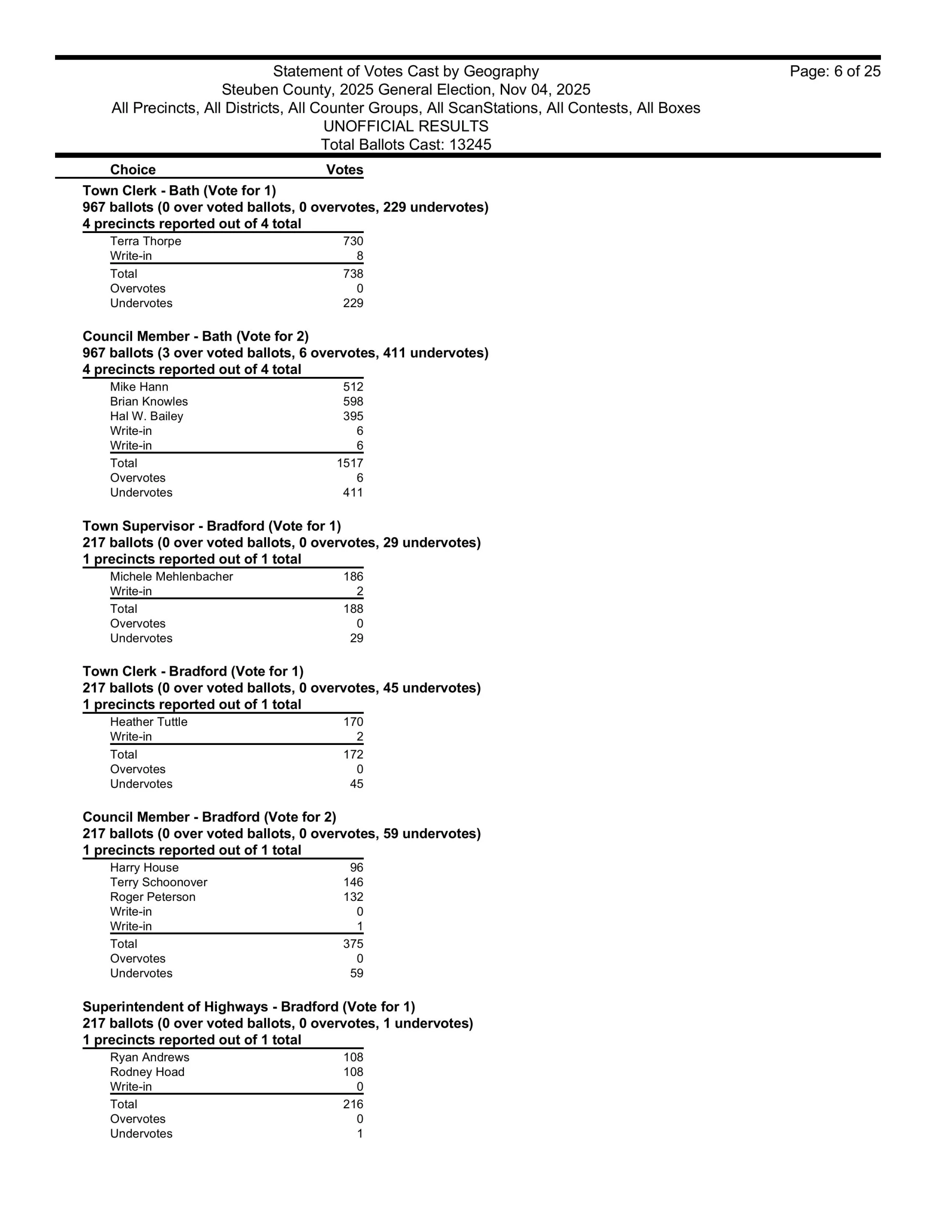 There are also races in Campbell, Caton, Cohocton, Corning, Howard, Erwin, Lindley, Wayne, Woodhull, Prattsburgh, Pulteney, Wheeler, Rathbone and Thurston.  Then, there are county legislative races in Bath, Prattsburgh, Pulteney, Urbana, Erwin, the Town of Corning, Caton and Hornby.