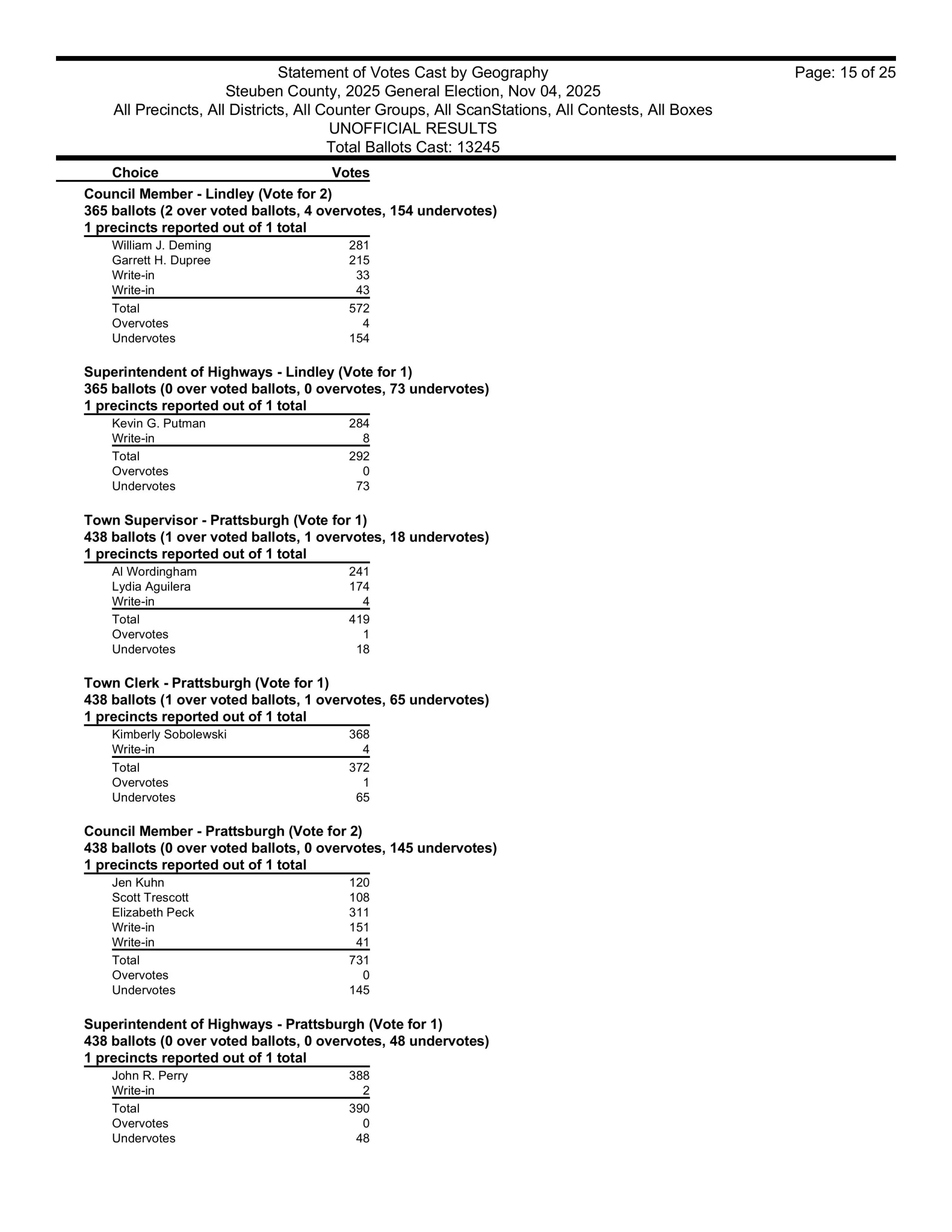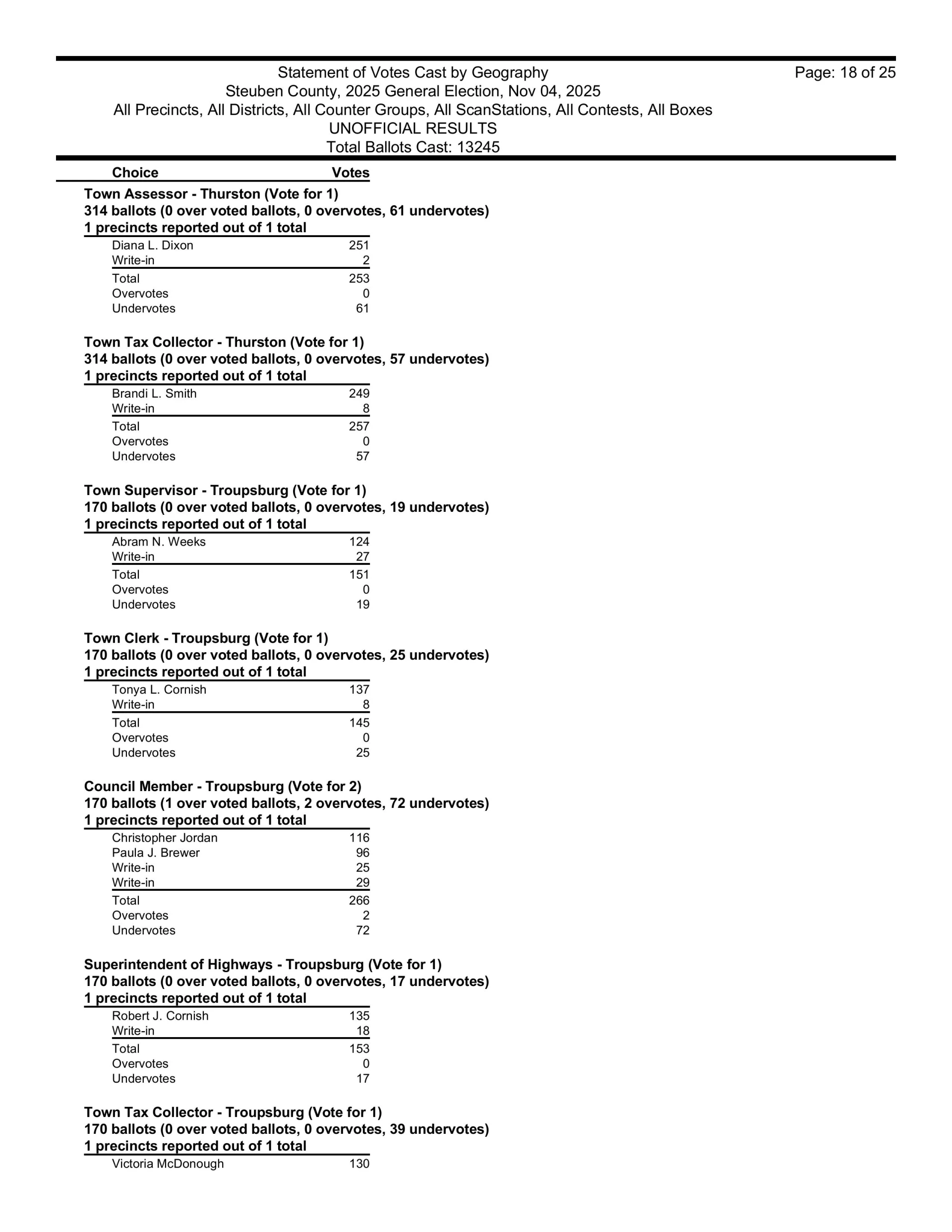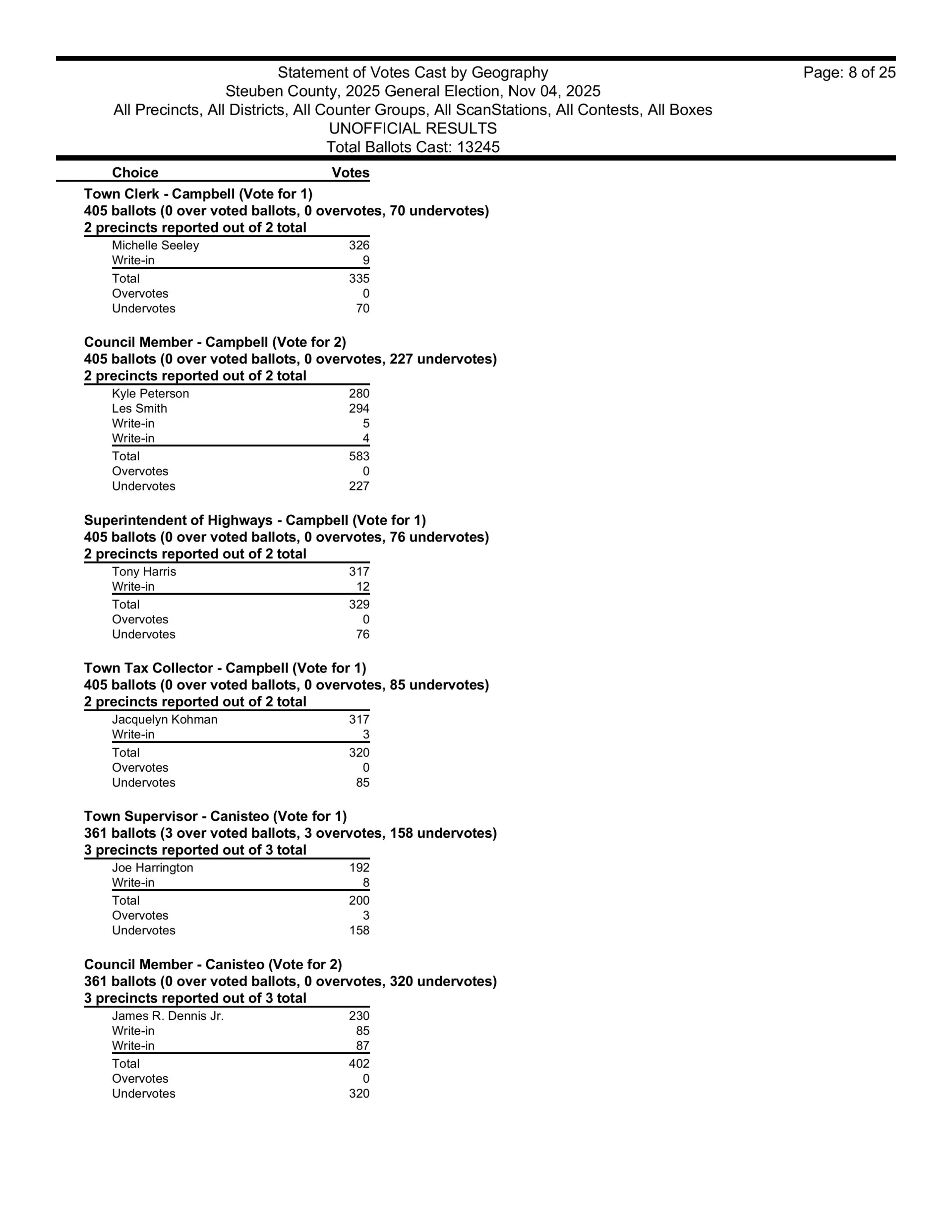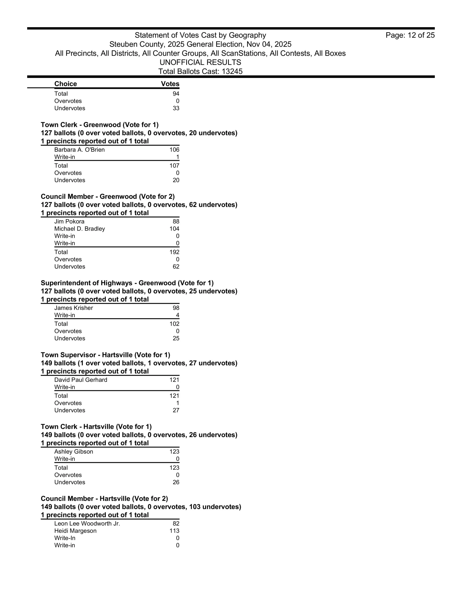 There are also races in Campbell, Caton, Cohocton, Corning, Howard, Erwin, Lindley, Wayne, Woodhull, Prattsburgh, Pulteney, Wheeler, Rathbone and Thurston.  Then, there are county legislative races in Bath, Prattsburgh, Pulteney, Urbana, Erwin, the Town of Corning, Caton and Hornby.