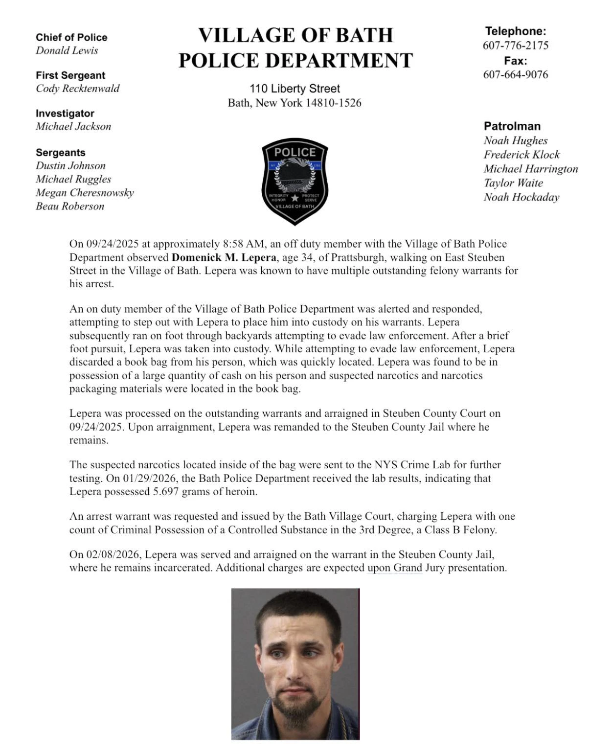 Our agency is about to go through a growth spurt. Undersheriff McNelis, who has been with us since I was elected in 2016, has decided to take a great opportunity in the private sector and will be leaving us in March. He has a long and distinguished career in law enforcement, and I am very sad to see him go, but feel blessed to have been able to work with him and call him friend. John started his career in the Steuben County Jail as a Correction Officer. He then was hired at the Hornell Police Department as a Patrolman and worked there until he was appointed to the New York State Police. He served as a Trooper and Criminal Investigator, working primarily in the Hudson Valley region until being chosen to work on Governor Pataki’s protection unit, often driving the Governor around New York State. He then continued investigating crimes for the New York State Police and eventually returned home to work both in the Bath and Wayland Barracks as an Investigator. After retiring from the State Police, he worked as a School Resource Officer in Canisteo, which is where I met him. Upon meeting John I was immediately struck by his integrity and intelligence. When it came time to interview for potential Undersheriffs, which we did with a three-panel interview procedure, he consistently rose to the top and was recommended at every turn. Since becoming Undersheriff, he has consistently and successfully managed every program we have created. Steuben County has greatly benefited from the knowledge and experience that Undersheriff McNelis brought to this Office. None of the many programs brought to life here would have occurred without his diligence and attention to detail. I am happy for my friend that he can spend more time with his wife, Beth, and family, but I will miss seeing him every day.