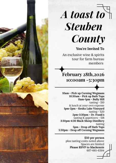 From Cornell Cooperative Extension: Join Steuben County Farm Bureau for an exclusive wine and spirits tour on Saturday, February 28th! The event is open to the public but attendees must be accompanied by a Farm Bureau member.